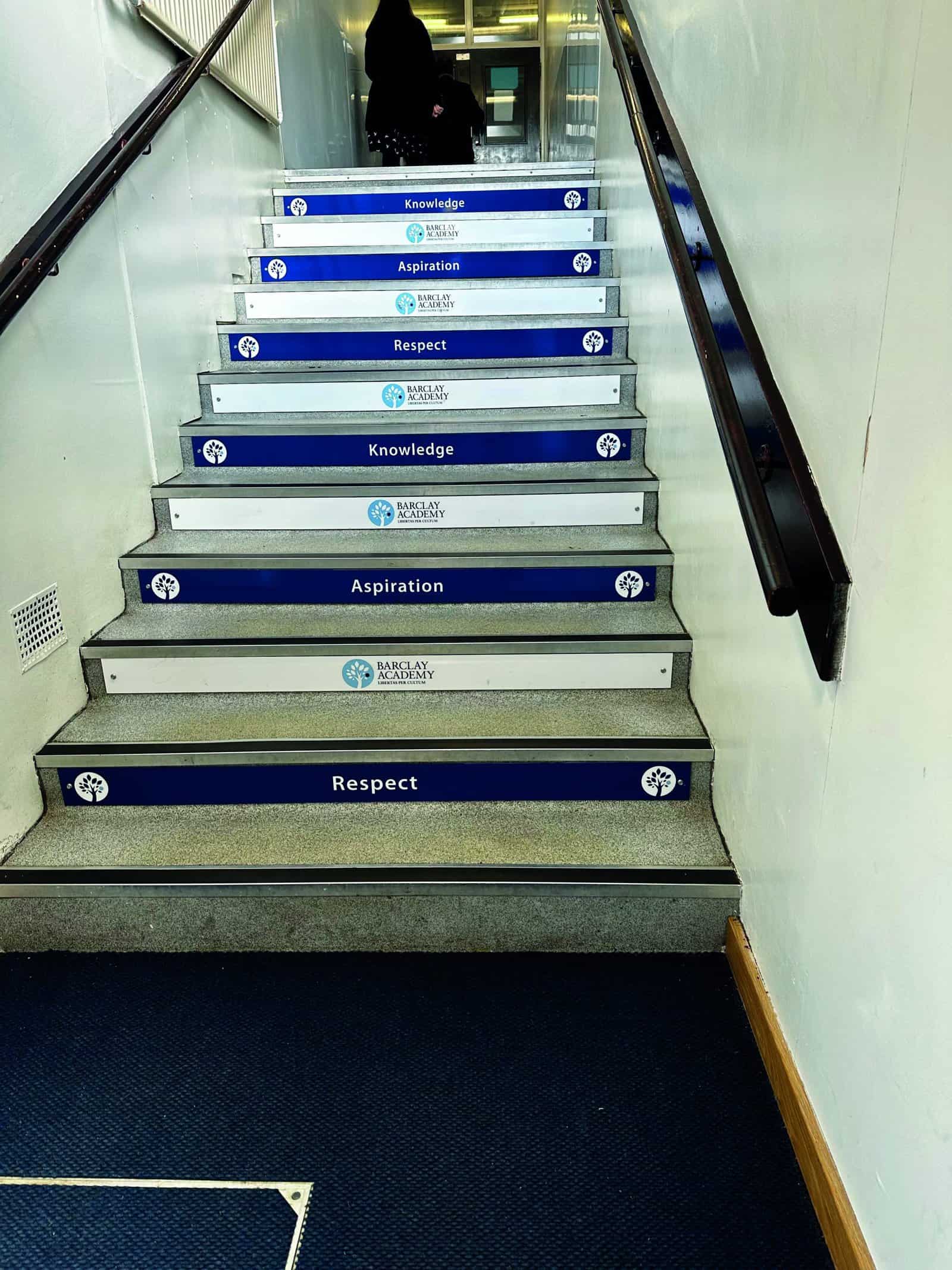 Produced in 3mm thick dibond material and fabricated to fit to the front side of stair risers.