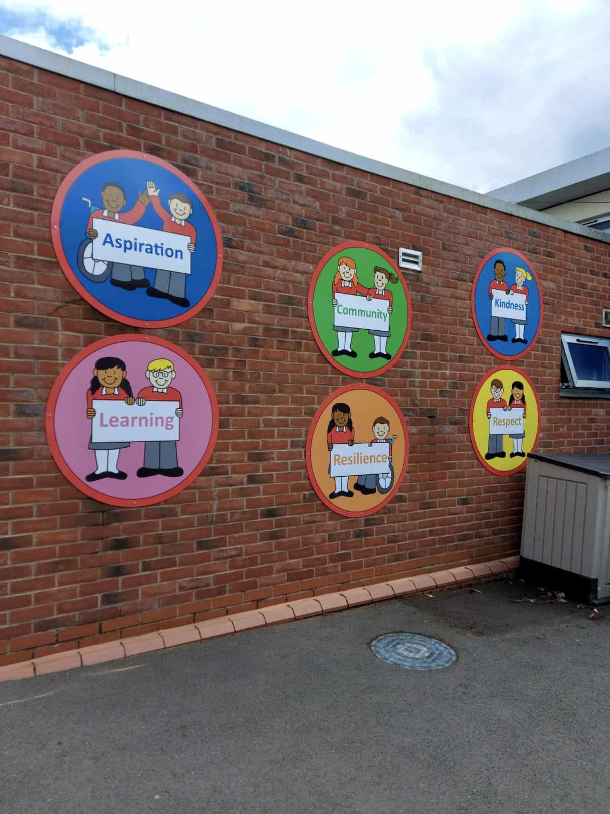 Printed with colourful child friendly designs using your school uniform colours and preferred ethnic mix. This range is a great way to celebrate your Values / Vision on external fencing or wall locations.