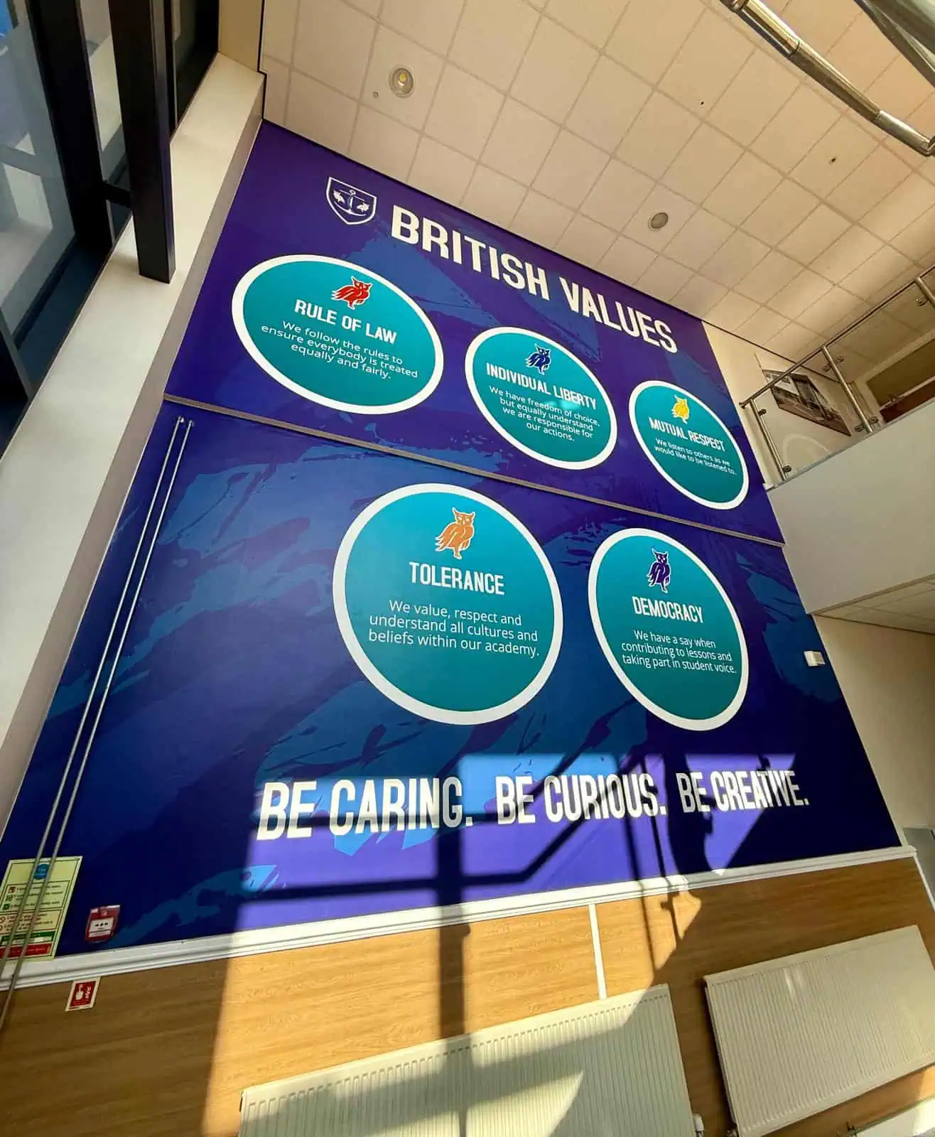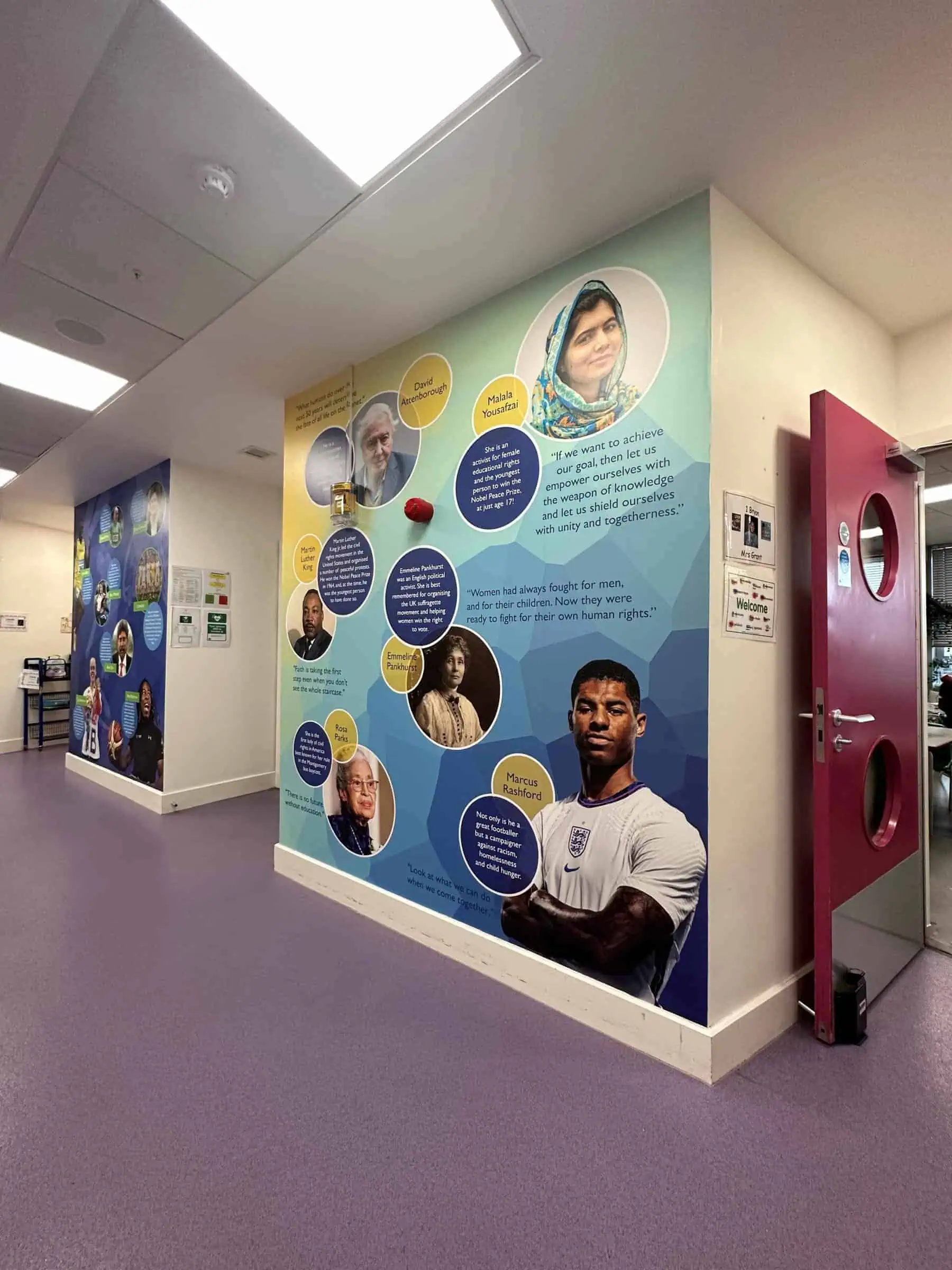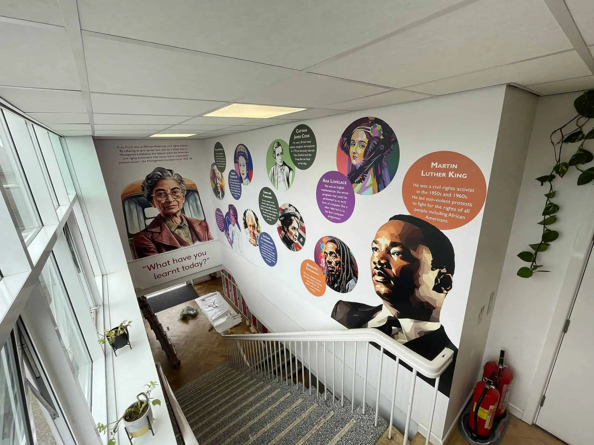 We can create a full colour design to meet your exact requirements. Whether it’s to celebrate your School Vision or Values in your foyer, transform a dull corridor or stairwell with a time-line or with images and quotes from inspirational people. Our costs include artwork creation at no extra cost!